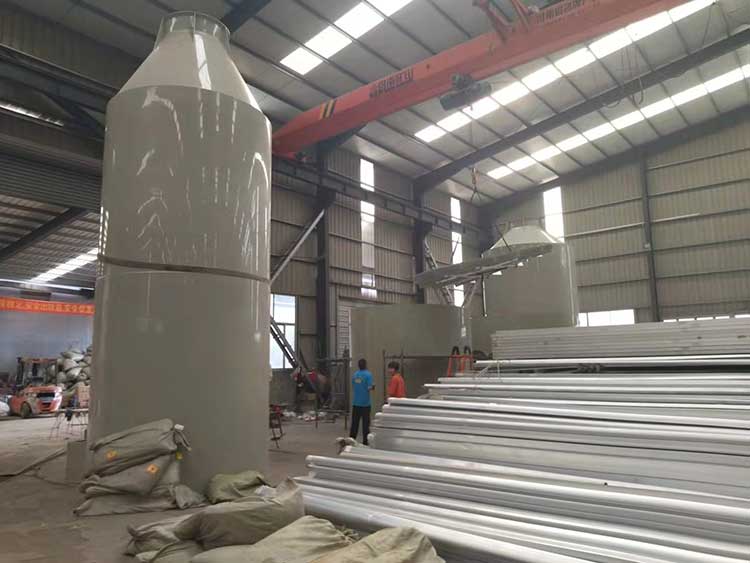 噴淋塔工作時,循環(huán)水在塔頂通過液體分布器,均勻地噴淋到填料層中,沿著填料層表面向下流動直到塔底,循環(huán)水泵循環(huán)工作。氣液逆流運行,抽入的廢氣由塔身入口進入塔體,自下而上穿過運動中的填料和水霧,廢氣和水進行熱交換,使廢氣溫度降低;凈化后的氣體從塔頂管道出口排出。由于上升廢氣和下降吸收劑在填料層中不斷接觸,所以上升氣流中溶質的濃度越來越低,到塔頂時已達到吸收要求后排出塔外。相反下降液體中的介質濃度越來越高,到塔底時達工藝條件要求,排出塔外。噴淋塔用于降低廢氣溫度、處理粉塵及顆粒物有很明顯的效果。