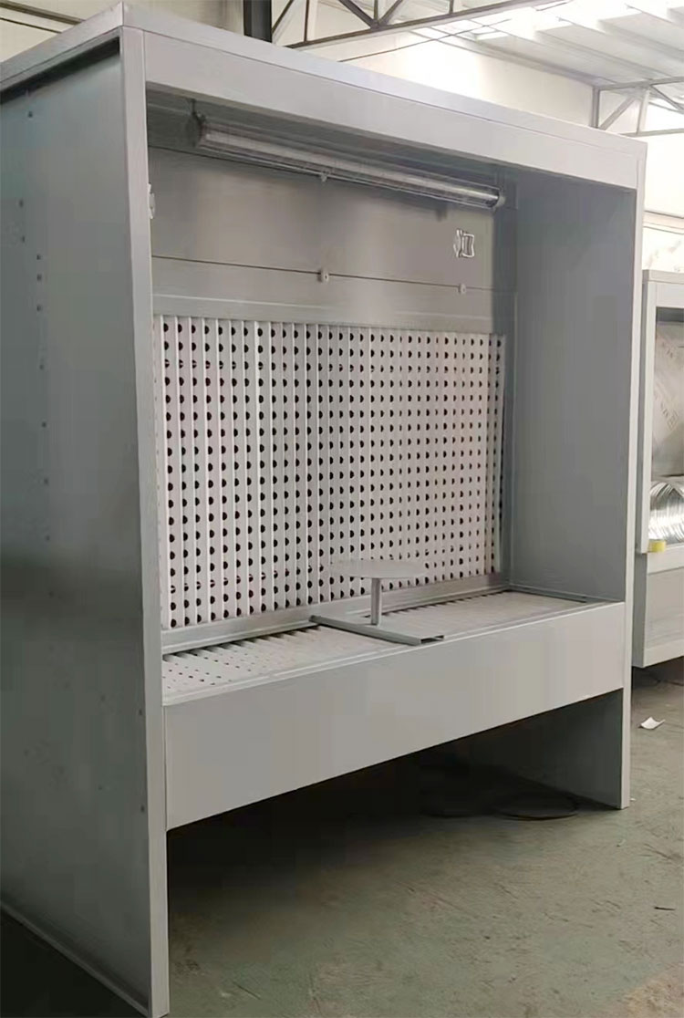 箱體尺寸長2.0米,1.0米,2.3米,臺面高度0.75米,臺面深度0.5米。臺面上附V型過濾紙。臺面帶小轉盤。吸附層使用V型過濾紙。抽屜層過濾使用漆霧過濾棉。