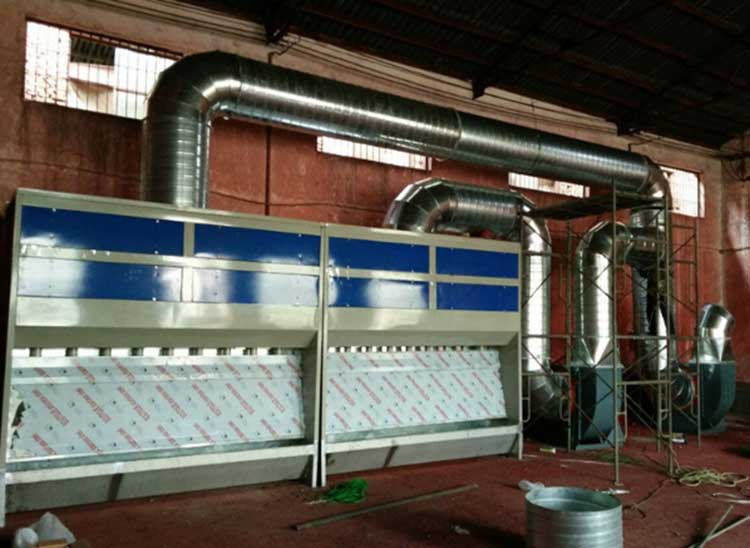 4、利用污水泵提升水箱中的水形成循環(huán)水幕,利用離心式風(fēng)機抽風(fēng),對噴漆作業(yè)過程中的漆霧有很強的吸附能力。通過獨特的水旋式處理,使漆霧與水汽更好的得到混合,從而落入污水槽中。
