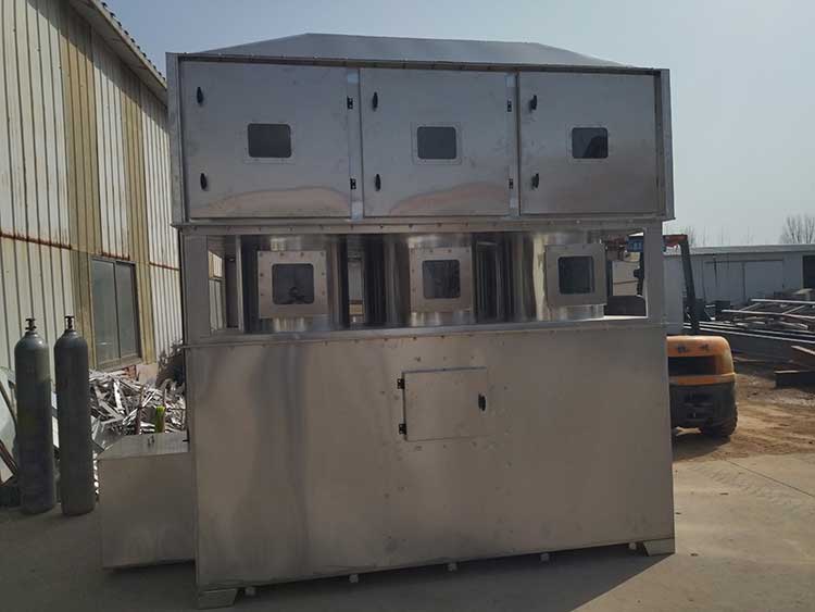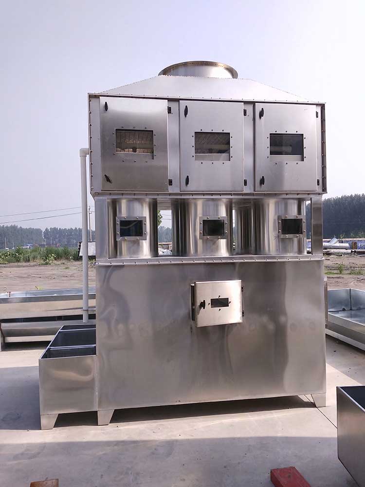 一、旋流脫硫塔工作時含塵廢氣由風管引入旋流塔內(nèi),經(jīng)過旋轉(zhuǎn)洗滌桶風帶加快,帶動填料球飛帶運轉(zhuǎn),在洗滌桶里,含塵廢氣與水霧充分混合洗滌、中和反應(水里面補充有酸堿時),廢氣經(jīng)過凈化后,再經(jīng)除霧層脫水除霧后由風機排入大氣或再進入其他凈化設備(光氧催化設備、活性炭吸附箱、催化燃燒裝置等),吸收液在塔底經(jīng)水泵增壓后在箱頂噴淋霧化而下,回流至箱底循環(huán)使用。
