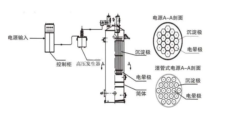 3.噴淋的水蒸氣在冷凝管壁形流動成帶電水膜,使纖維粉塵及油霧顆?;胙b置底部流出,從而避免了粉塵和油霧對電極和管壁的沾污。