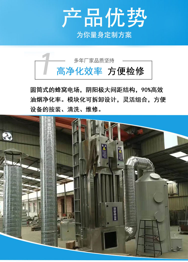 1.高凈化效率:圓筒式的蜂窩電場,陰陽極大間距結(jié)構(gòu),90%高效油煙凈化率。