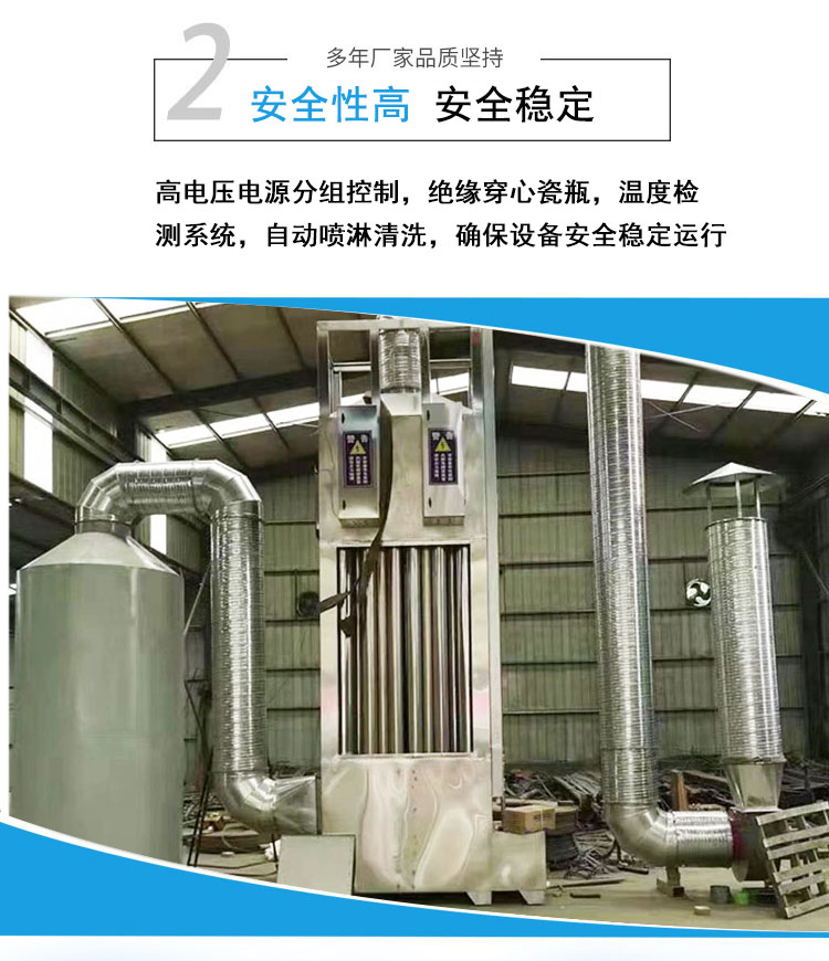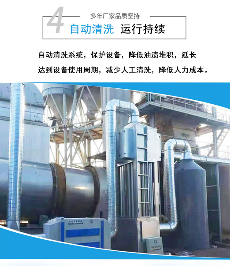 1.采用創(chuàng)新性的噴淋和多層高壓靜電場一體化混合設(shè)計,除塵、除油煙、降溫、滅火效果優(yōu)異,沒有滴油、堵塞、燃燒的現(xiàn)象發(fā)生。
