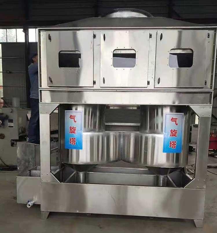 氣旋混動噴淋塔設備作業(yè)時,漆霧在負壓風機牽引力的作用下進入高速旋流導軌裝置,漆霧、旋風與水在高速旋轉的進行氣液乳化反應。氣動混流裝置的高速運轉,使得漆霧與旋轉液體充分混合,在離心力的作用下達到氣液分離。氣旋筒內部采用水泵循環(huán)給水,由安裝在隔水層底部的螺旋噴嘴噴出來,漆霧分離出來的粉塵顆粒物下沉到水箱底部,分離后的氣體進入環(huán)保填料隔水層,然后進入后段的廢氣處理設備,由此經過氣旋混動噴淋塔處理漆霧或顆粒物的凈化率可達95%以上。