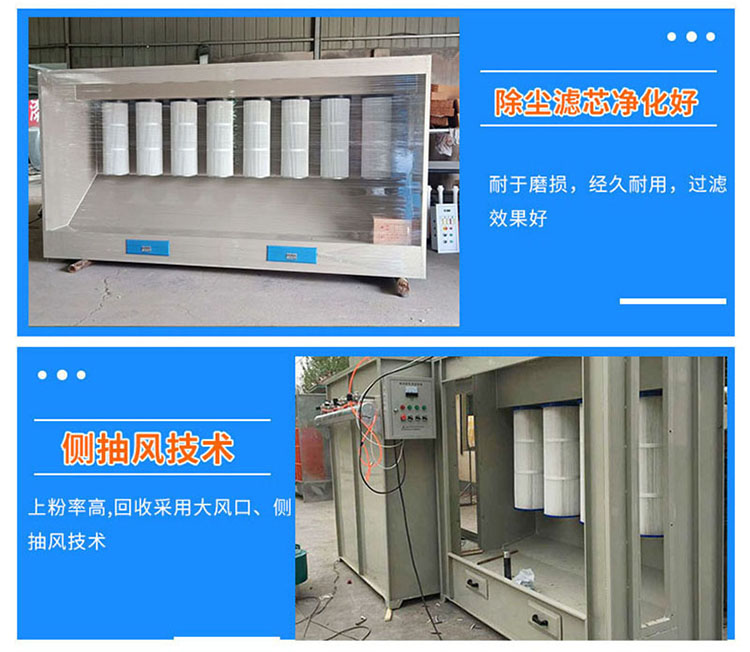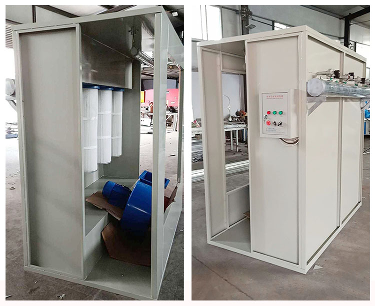 塑粉回收機(jī)由箱體、粉末過(guò)濾系統(tǒng)、抽風(fēng)系統(tǒng)、控制系統(tǒng)等四大部分組成,噴涂時(shí)產(chǎn)生粉塵經(jīng)過(guò)高精度濾筒過(guò)濾,凈化氣流由抽風(fēng)機(jī)排出室外,整個(gè)程序由電氣自動(dòng)控制。
