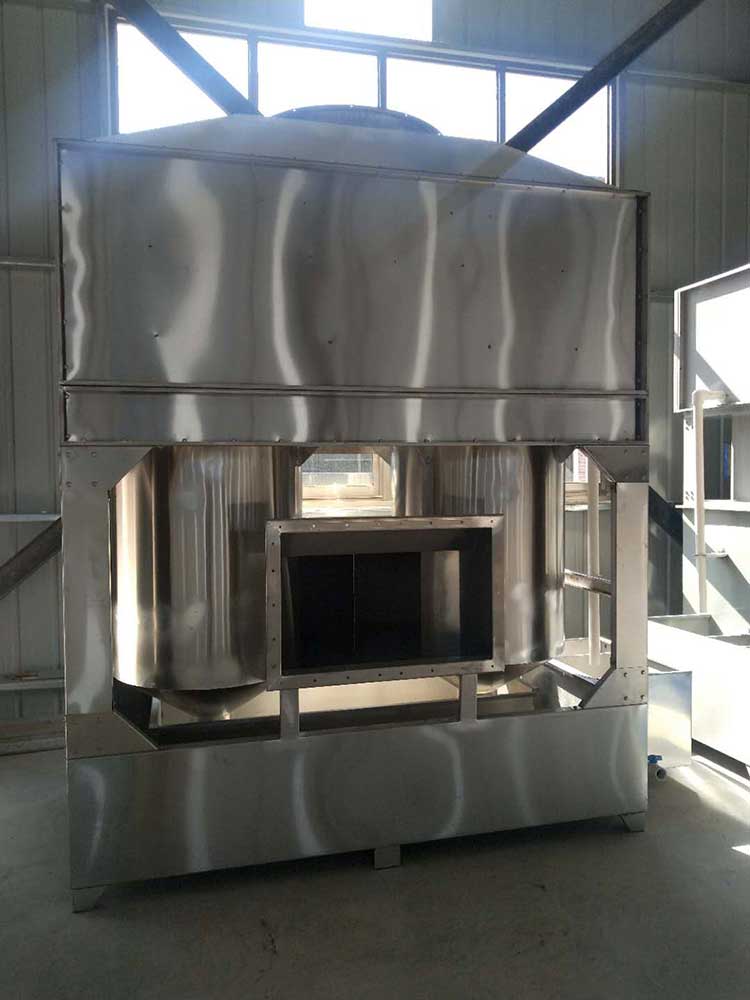 5萬風量氣旋塔規(guī)格:L4.8*W1.2*H3.0(米),4桶直徑0.8米,1臺4.0KW水泵。進風口2個,尺寸為長1.1米, 寬45厘米,除霧層使用鮑爾球。