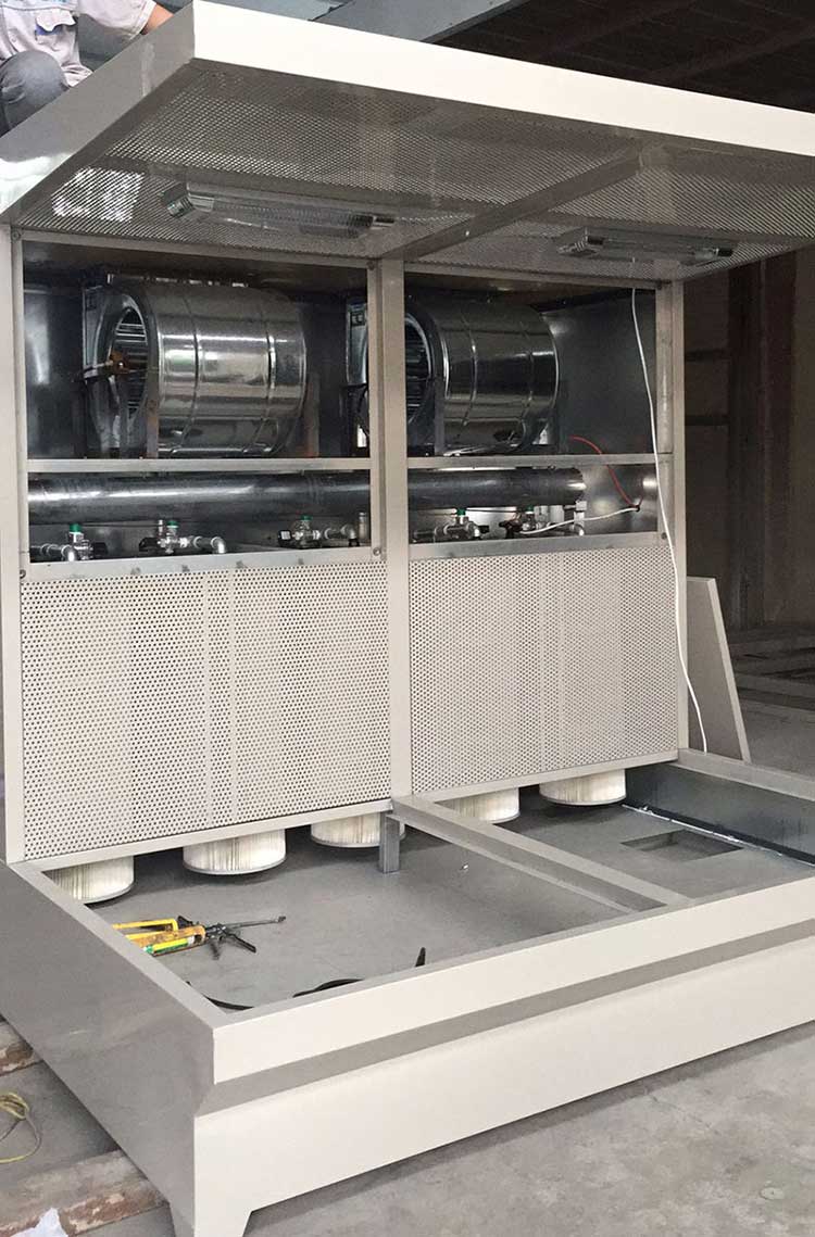 多工位打磨吸塵工作臺工作時,把工件放在工作臺面上打磨,在排風(fēng)機(jī)的抽吸作用下,將工件上打磨出來的粉塵、灰塵等物吸入機(jī)內(nèi),打磨出來的粉塵不會在操作者的呼吸處停留,而隨抽風(fēng)的氣流迅速抽進(jìn)主機(jī)里,帶有粉塵的氣流通過百味窗透過濾芯排風(fēng)過濾系統(tǒng)流向機(jī)外,粉塵顆粒經(jīng)過濾芯過濾后掉下主機(jī)的集成箱里,干凈的空氣排出。還有一部分氣體通過回風(fēng)道經(jīng)過風(fēng)口棉,再次過濾吹到工作臺面,從而達(dá)到循環(huán)的***佳效果。這樣大大改善了工作環(huán)境。